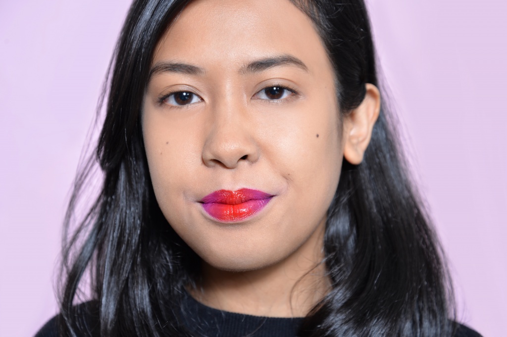 Amelia can pull off pretty much any lipstick colour. I know this because I’ve seen her wear every shade of the rainbow every other day in office and at events; so she’s really the perfect person to try the block colour trend. Here, Amelia wears PK368 on top and RD166 (a star shade) on the bottom. It’s a simple, but fun way to play with different lipstick colours.